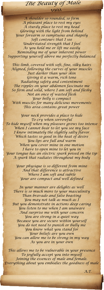 I believe our society, while it is changing, still stereotypes and limits both male and female sexuality and sensuality. I believe men are just as imprisoned by these roles as women are. Because our society doesn't openly reflect and accept the range of human sexuality that has existed for as long as history has been recorded, men are forced to compartmentalize themselves and their sexual nature. In short many men don't have "good" options for the exploration and expression of their sexual selves.